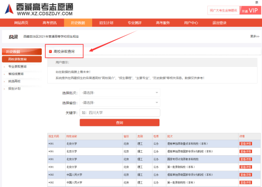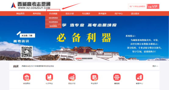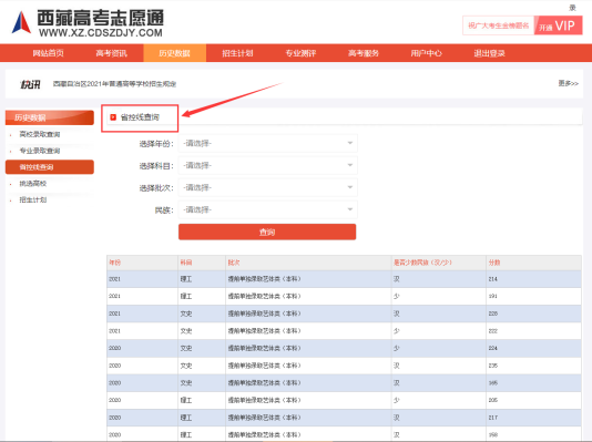首页点击“历史数据”,查询院校录取数据、专业录取查询、省控线查询