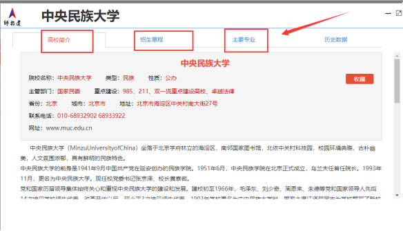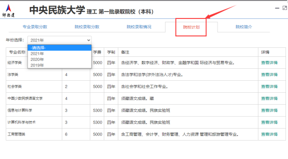 通过点击“选择批次”、“选择省份”、“关键字”选择需要查找院校,点击“查看详情”查看院校录取分数、专业录取数据、院校录取情况、招生计划、院校简介、招生简章、主要专业!