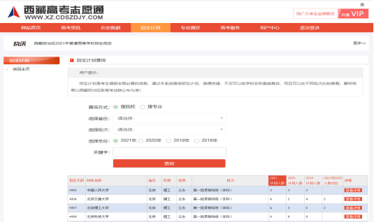 通过点击“查询方式”、“选择省份”、“选择批次”、“选择年份”、“关键字”选择需要查找院校招生计划,点击“查看详情”查看历年招生计划情况,同时在该页面也能查询“历史数据”相关内容!