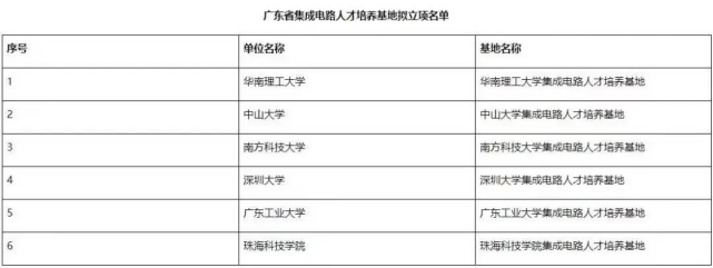 为进一步强化集成电路人才培养,广东省教育厅发布公示,华南理工大学、中山大学、南方科技大学、广东工业大学、深圳大学、珠海科技学院等6所高校集成电路人才培养基地拟被立项为省集成电路人才培养基地,其中,珠海科技学院是唯一一所拟获批立项的民办高校,今天小编就来为你解读这些学校!
